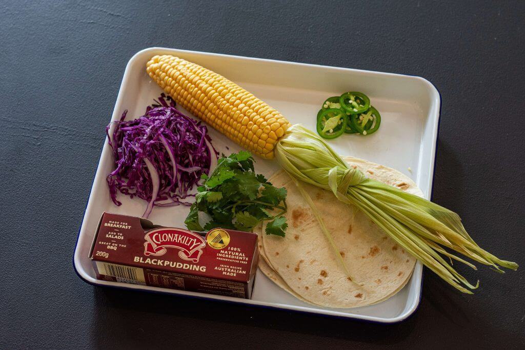 - Drizzle a little mayo on tortilla, place some black pudding, corn and jalapeno into tortilla. Sprinkle coriander over and drizzle a little more mayo over the top. DEMOLISH!