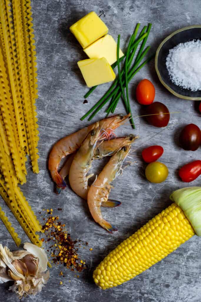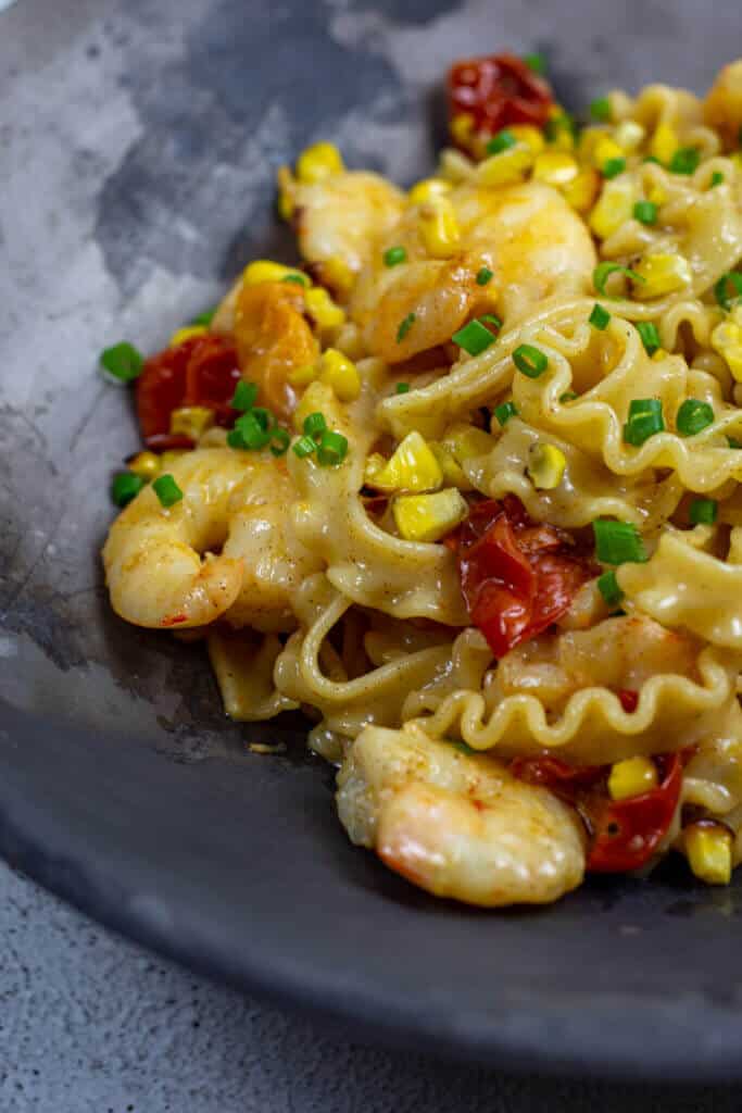 - Add tomatoes & corn to the prawns. Then add in the cream sauce and pasta. Stir to combine it all together and serve with a sprinkle of chives