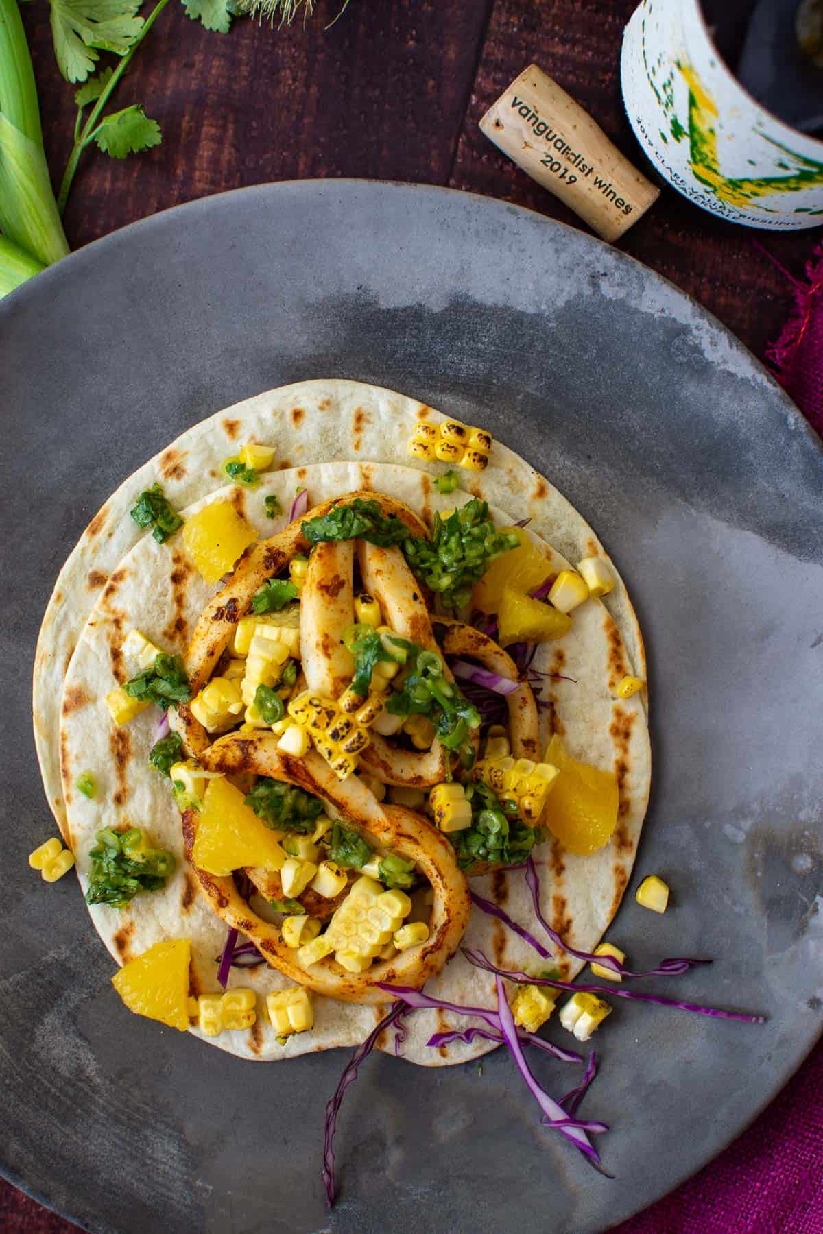 - Place the tortilla on the plate, top with red cabbage, calamari, orange segments, charred corn and a drizzle of the coriander dressing