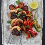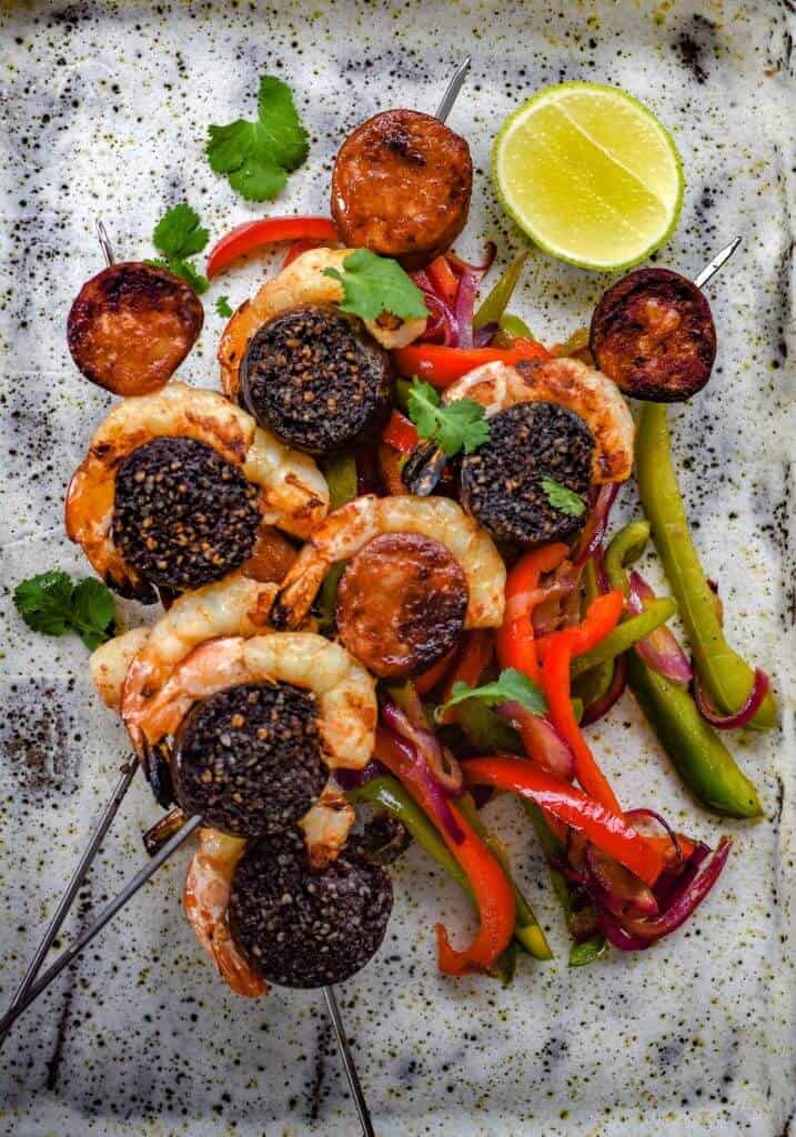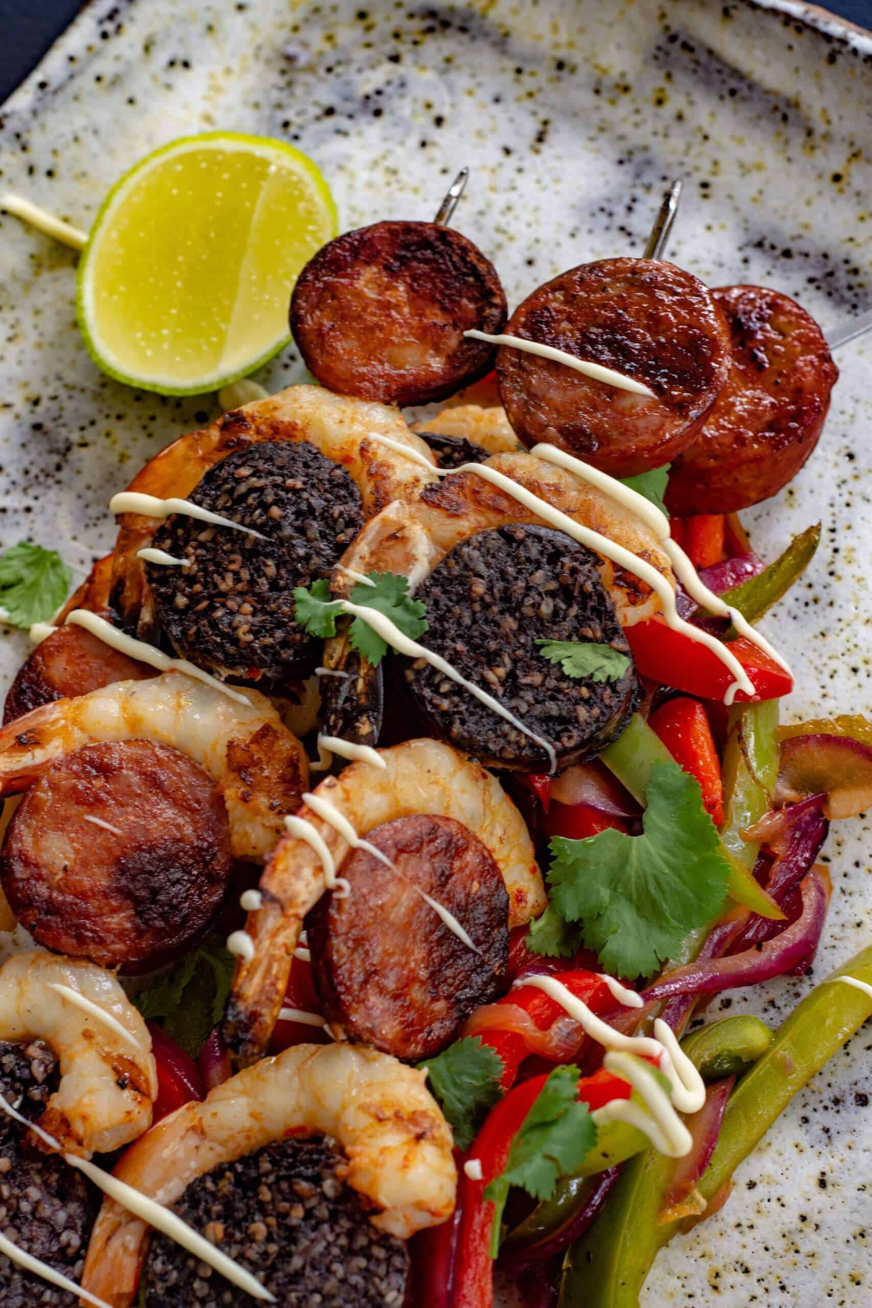 - Using 4 skewers add the black pudding, then prawns and then chorizo to the skewer, brush with remaining marinade and grill for 2 - 3 mins per side