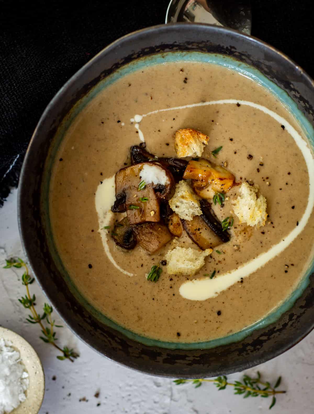 - Place soup in a bowl and top with cooked mushrooms, croutons, thyme & drizzle of cream