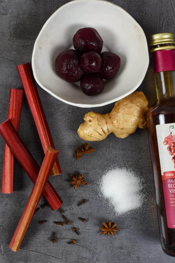 - Blend spices and add to rhubarb along with pre-cooked beets, sugar & vinegar and cook for a further 5 minutes