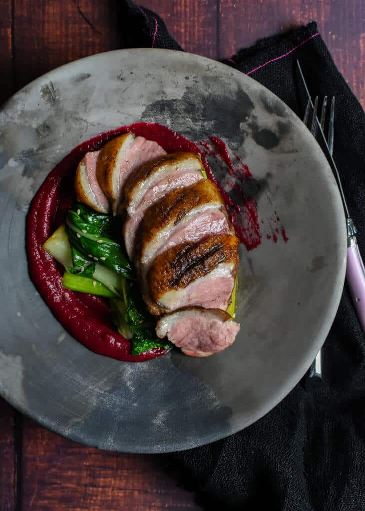 Place the duck breast into a cold pan and on a low heat allow the pan to heat up slowly while the duck is in the pan. This process allows as much fat as possible to release and for the skin to brown and crisp up nicely, after approx 8 minutes, flip the breast and cook for 2 minutes skin side down. At this stage, I place the duck on a wire rack and into the oven for a further 3-4 minutes until the internal temperature is 52c. Remove from the oven and leave the duck to rest on the rack for 8 minutes before slicing. Resting is crucial as it allows the juices to redistribute, leaving you with a beautifully pink duck breast.