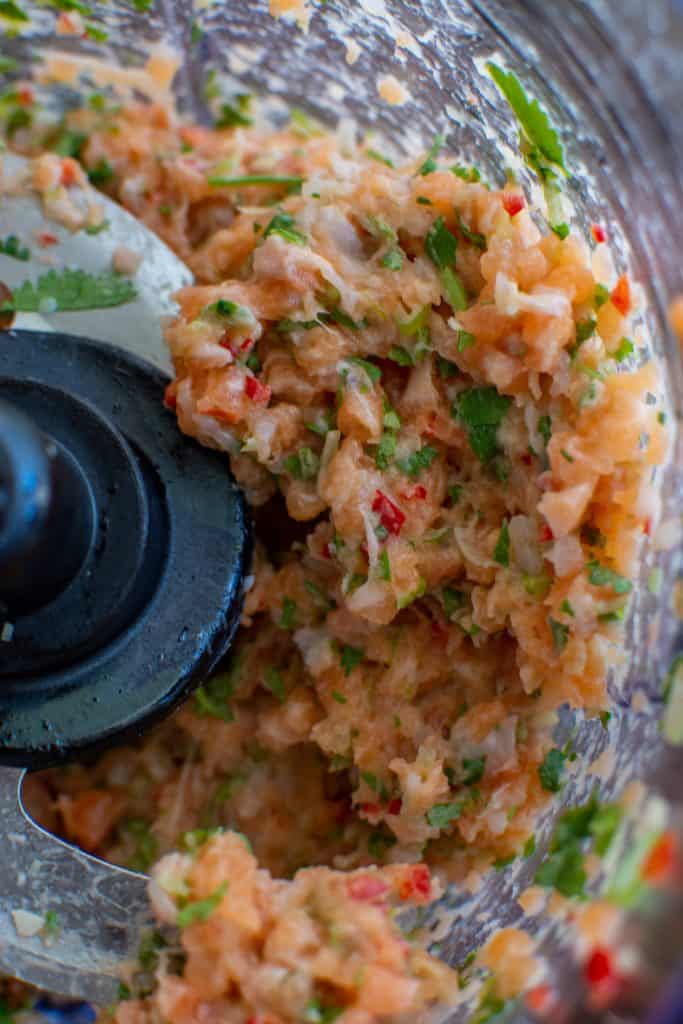 - if you process them too much you will have a gummy chewy salmon burger – by only pulsing about 10 times retains the fish texture