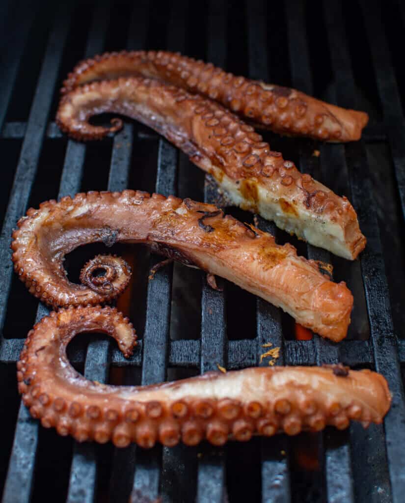Once you have followed these simple steps, cut the tentacles into individual pieces. Heat up that BBQ or grill pan, oil and season your octopus and grill it for 2 minutes per side until charred, crispy and heated through.