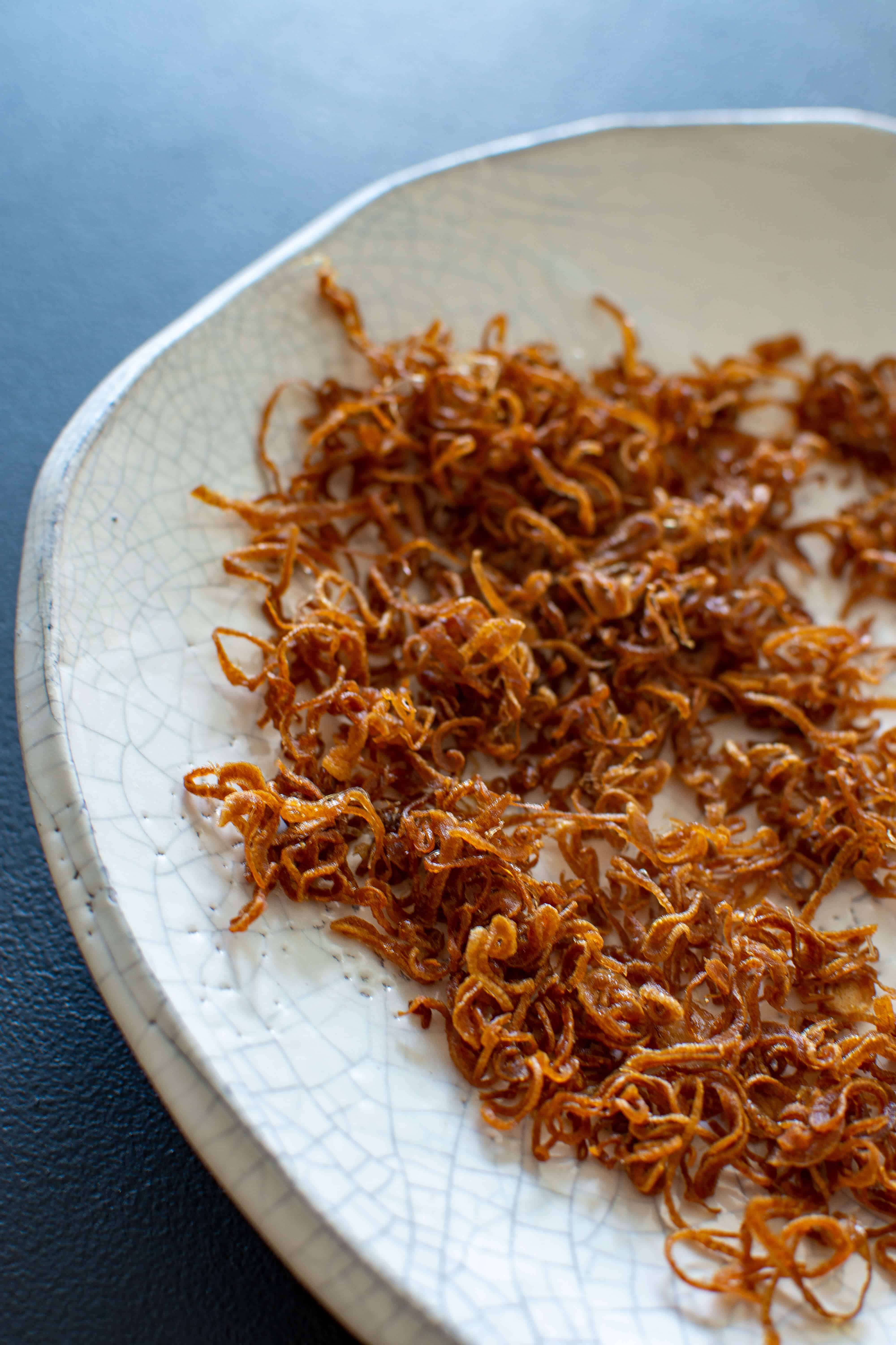 This may seem weird at first because we are always told to cook/fry in hot oil. Well, in this case if we drop shallots into hot oil they will just burn instantly. Using room temp oil allows the shallots to slowly cook and become beautifully crispy.