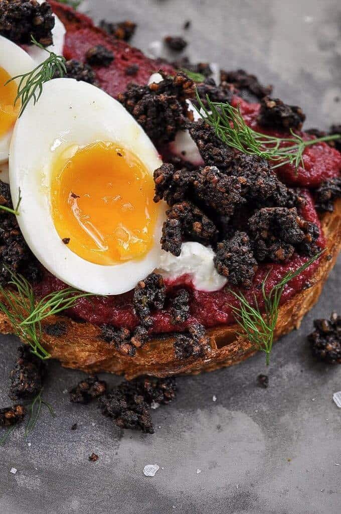 - Smear hummus onto sourdough toast. Cut soft boiled egg in half and place in hummus. Spoon goats curd around the egg/toast and sprinkle black pudding on top. Garnish with dill - if using.