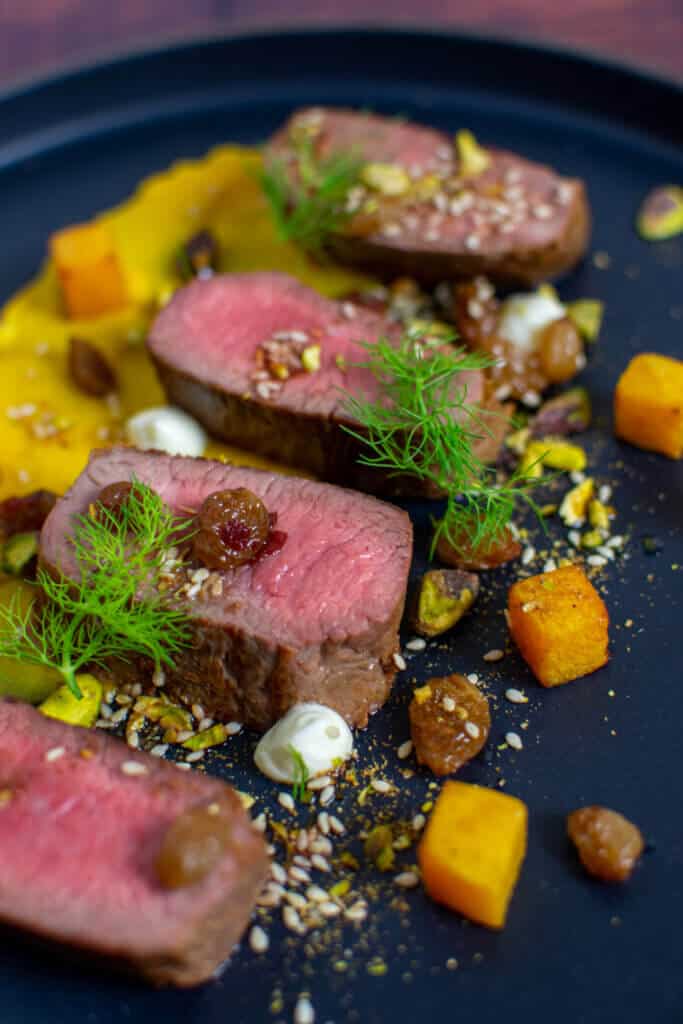 Aside from looking pretty every component is a hit. We have delicious lamb backstrap, smokey smooth squash puree, texture from the delicious pistachio dukkah, creamy goats cheese and a little zing from those pickled raisins #itsawinner