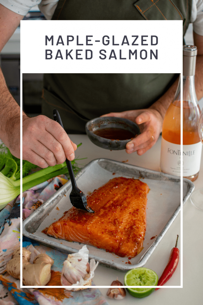 Start by placing the salmon skin side down on a lined baking tray. Glaze the salmon with your sexy brown butter glaze. Oh, sorry, I totally forgot - pour yourself a glass of Fontenille rose 😉 Then place the salmon into the oven at around 150-170c. The reason for the lower temp is that the salmon cooks slowly, which means less albumin is released.