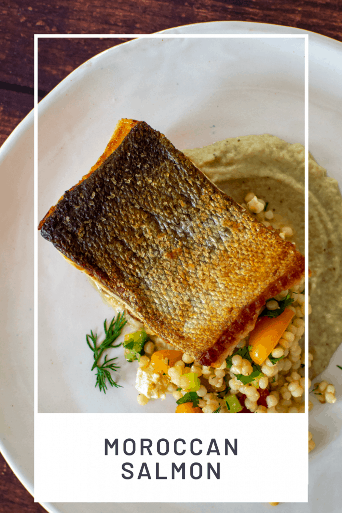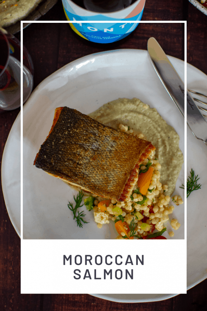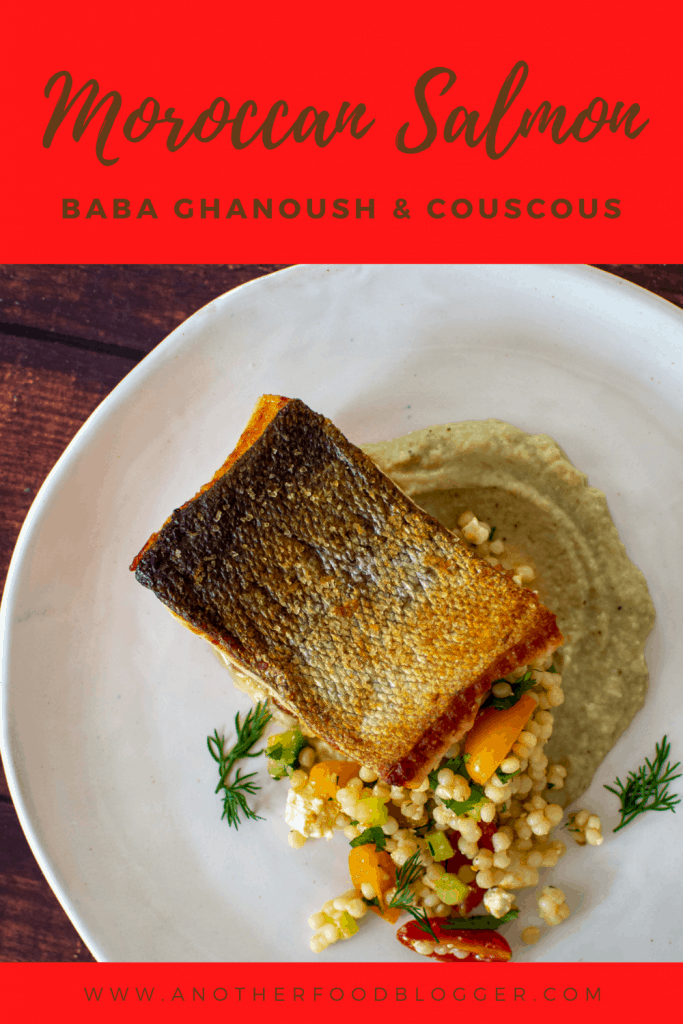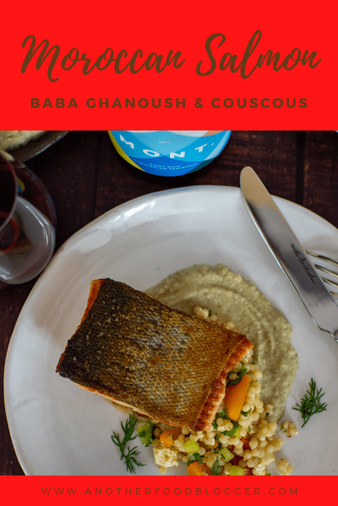 Crispy skin, smokey baba ghanoush and simple pearl couscous. If this sounds like something you would like on your table tonight or sometime soon then read on and learn how I made this epic Moroccan salmon dinner!