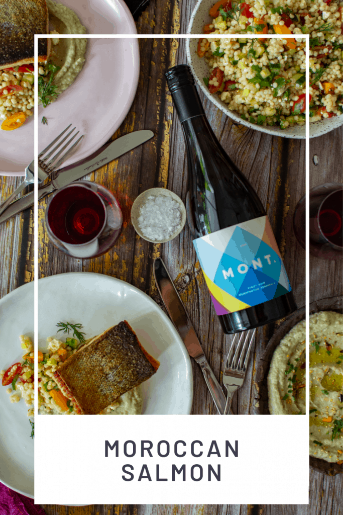 One of my favourite things to pair with pinot noir is salmon. Especially salmon with crispy skin or grilled salmon. The oiliness in the fish and firmer texture stands up really well to a light-bodied red wine so the Mont Wines Pinot was a no-brainer for this Moroccan salmon dish.