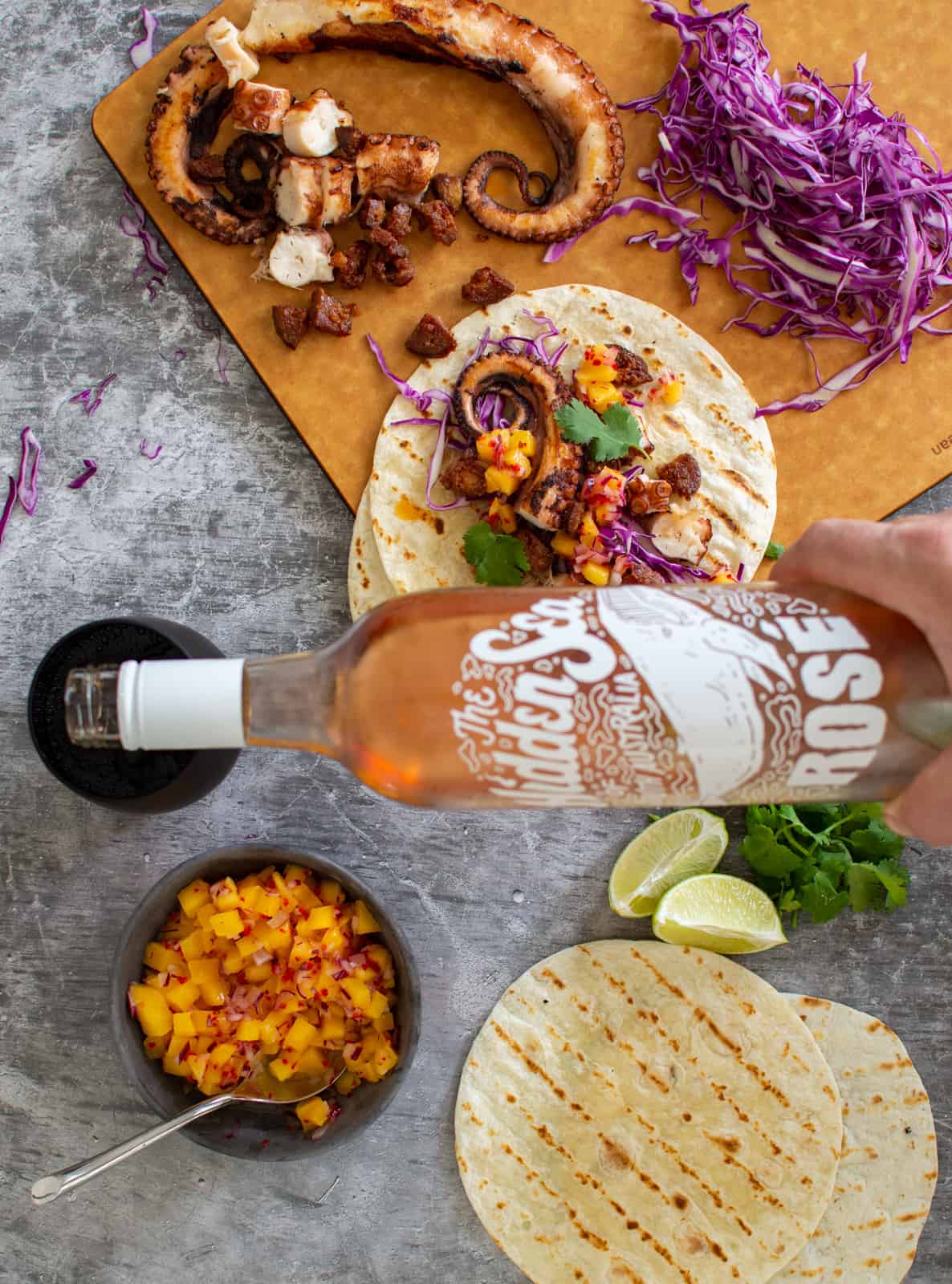 You guessed it this delicious octopus taco recipe is paired with the even tastier Hidden Sea rose. At $98 a 6 pack AND free shipping not only is it a bargain but as discussed it's all for a great cause too.