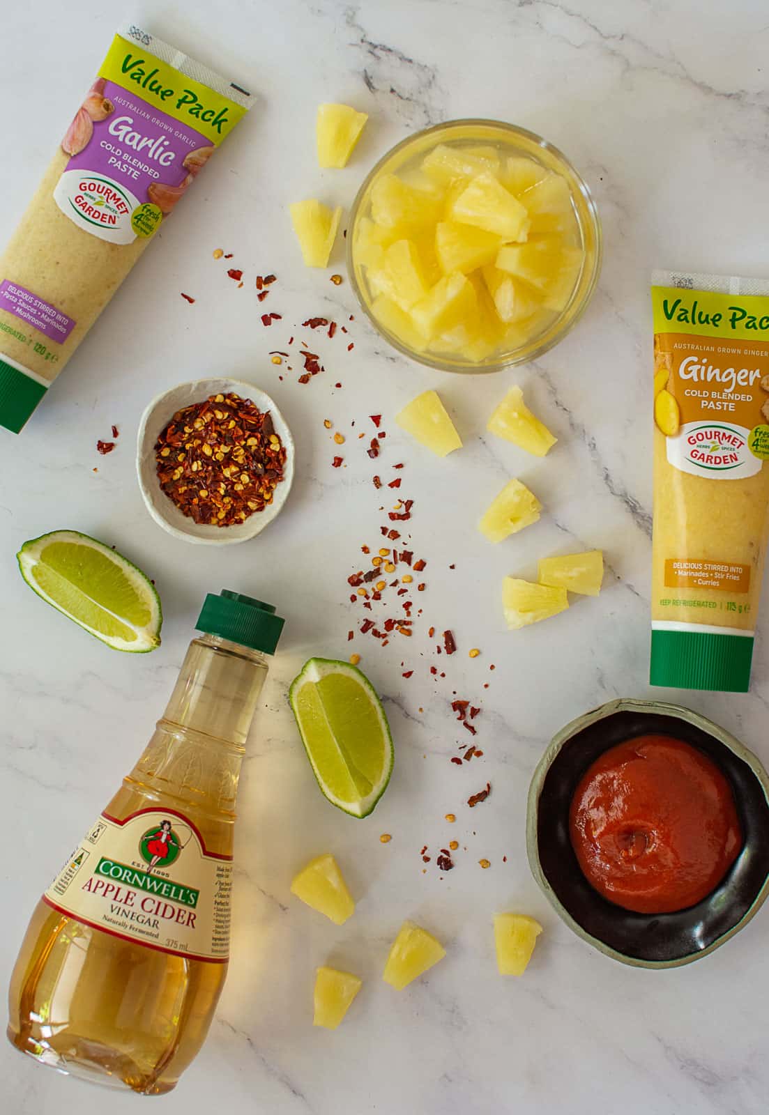 Simply blitz up the pineapple, add the remaining ingredients (except cornflour & lime) and heat it up, once simmering and has thickened slightly add your lime juice and cornflour/water mixture. The sauce can be made in advance and due to the level of vinegar going into it will keep in the fridge for a couple weeks so dare I say make a double portion and enjoy it more than once 😉