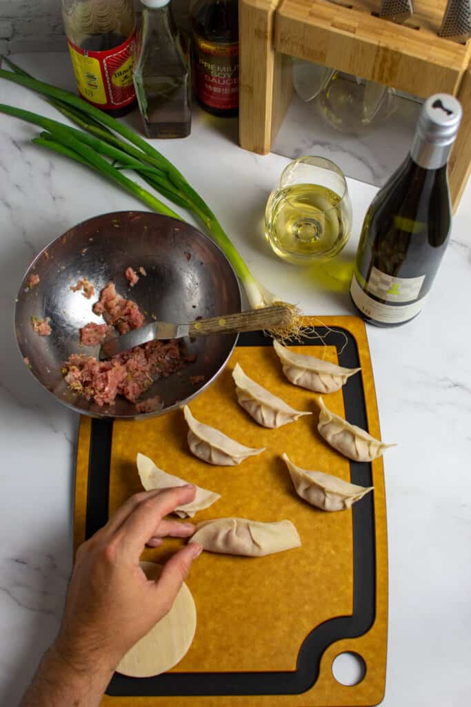 The key to folding them starts with the amount of filling you use. Start small and work your way up. Initially, a heaped teaspoon is enough to work with but after a while, you can add a little more. Rub a little water around the edge of the dumpling (this helps to bind them together) and get folding. If you want to make it easy for yourself then go with the old fold in a half-moon shape. Literally, just fold the dumpling in 1/2, press the air out gently and press the edges together all around.