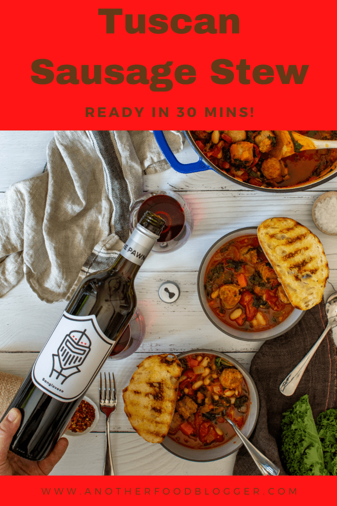 What better way to showcase a beautiful Sangiovese than with a Tuscan style sausage stew. Rich with vegetables, spices, herbs and some delicious Italian sausages I can't think of a better pairing than a bowl of this, crusty bread and (at least) one bottle of The Pawn Wine Co Sangiovese!