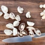 - Cut mushrooms to equal sized pieces – small button mushrooms left whole and larger ones in half
