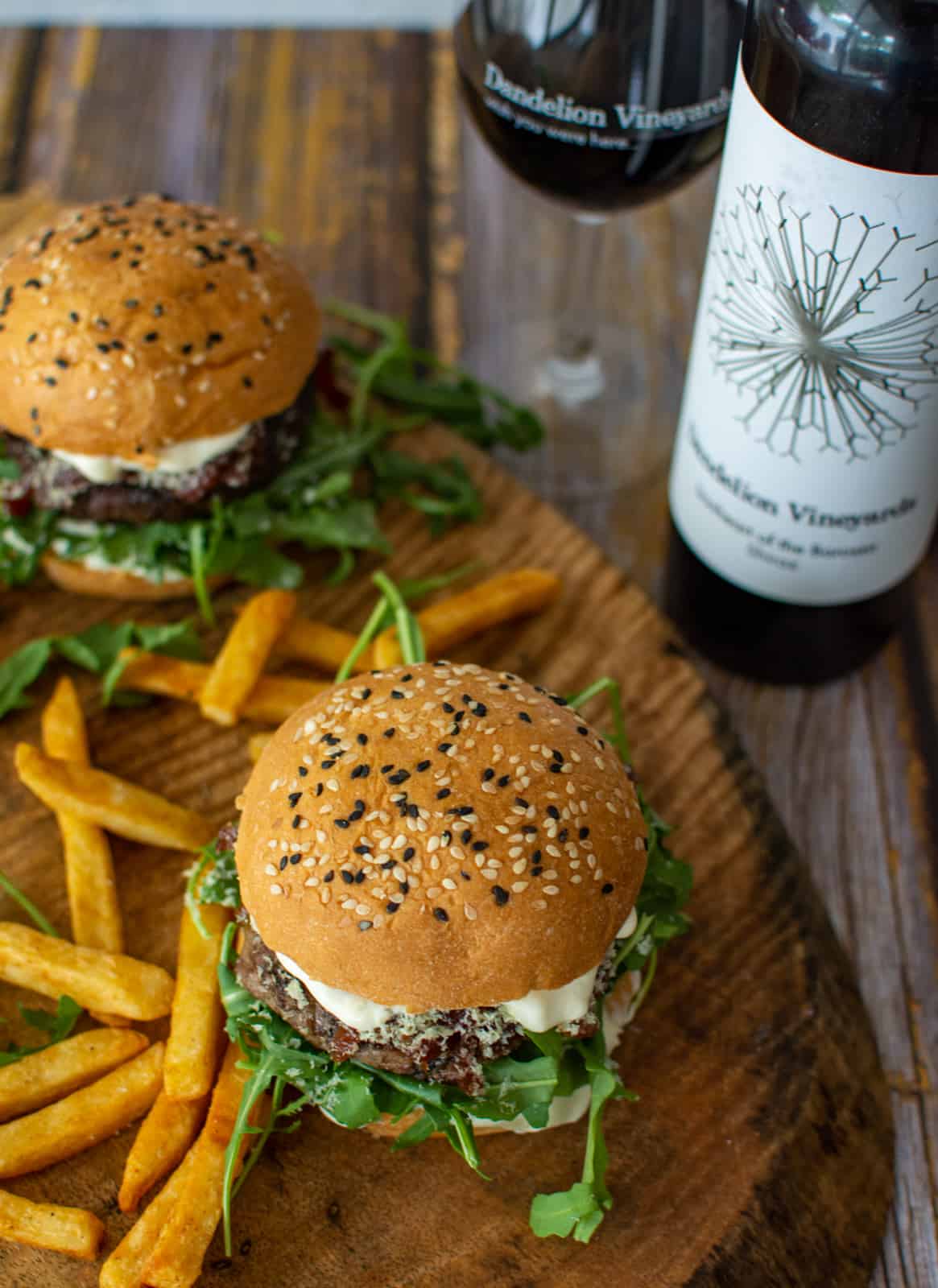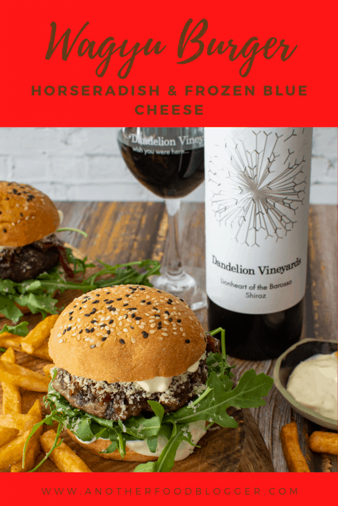 What a combo! Delicious Peter Augustus Butchers wagyu burger, cooked to perfection on the BBQ, topped with spicy, sticky & sweet caramelised onions, peppery rocket, horseradish aioli and grated frozen blue cheese. All of this paired with a cracker of shiraz from Dandelion Vineyards. It's going to be hard not to read on and race to the store for the ingredients!