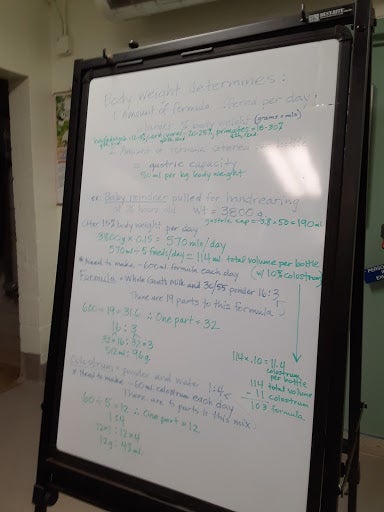 This board shows examples of the equations needed to make formula for one animal. Most don't expect the amount of work and knowledge it takes to do this job, so if you are interested remember to pay attention in math!