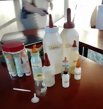 This is a collection of different nipples they use for the babies at the Zoo. It is very important to ensure the nipples are the right shape and the hole is the right size. The one they use for the royal antelope is custom made by a costume and prop designer.