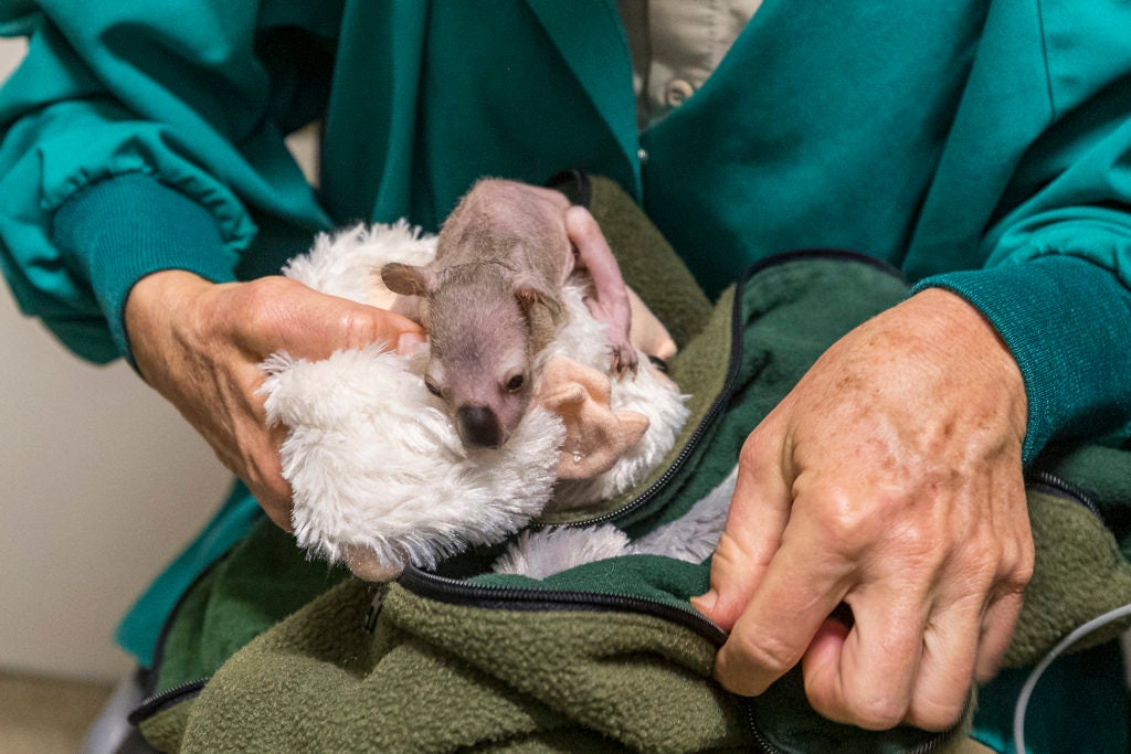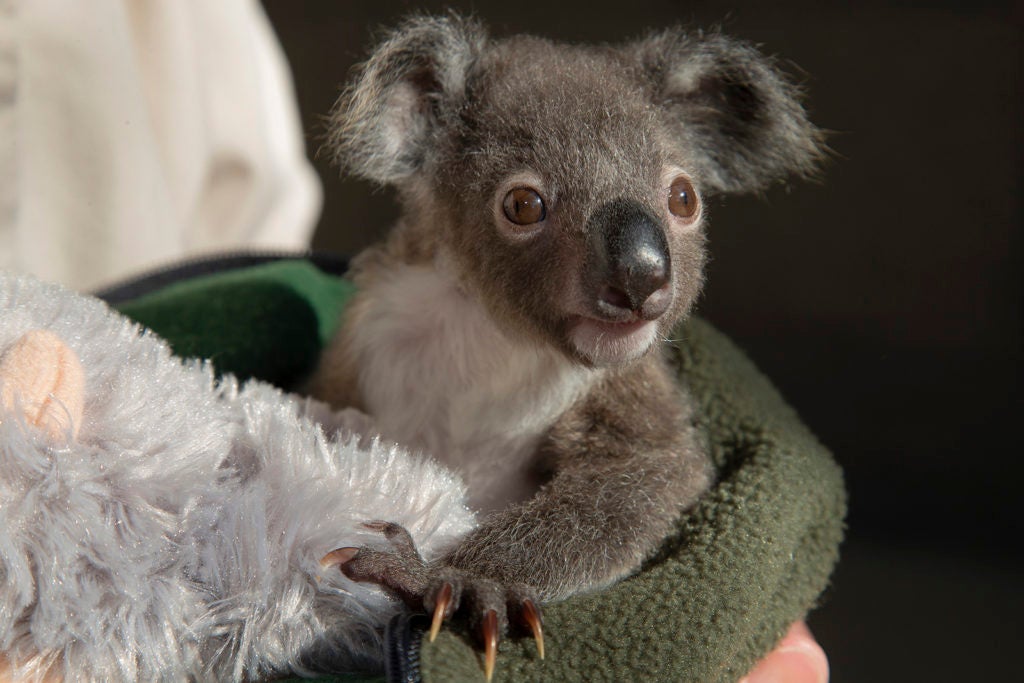 The joey has since graduated from the incubator to spending about eight hours each day in cozy enclosure with eucalyptus leaves to practice eating, and a plush koala to climb on. Happily, he now leaves the pouch to go potty—a milestone any parent can appreciate! Additionally, his hand-eye coordination is improving. “He’s grabbing leaves and teething on the stems,” said Becky.
