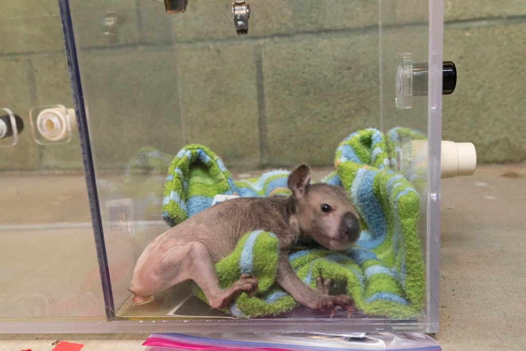 In those first few weeks, they almost lost him twice, Becky said. The first time, he was listless and lethargic but—as though feeling all the tension and mojo directed at him—he rallied. A week later, Dr. Cora noticed open-mouthed breathing when she was conducting a routine check. “Fungal pneumonia is common in marsupials,” she said. So the little guy was whisked up to the Zoo hospital for breathing treatments. After two weeks of care there, he returned to the koala compound, where he stayed in a toasty, humid incubator containing a suspended faux pouch (made by volunteers) with a “pouch stuffy” inside to hold on to, and a plush koala to climb on outside the pouch. SDZ wildlife experts continued to care for him. By this time his was growing, but remained “bubble gum pink from the waist down,” said Becky. “He looked like he was wearing a hairy T-shirt.”