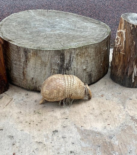 Here is a La Plata three-banded armadillo. If you look closely, you can see that Bola has three bands on her back. This allows her to completely close up into a ball, which is unique because this is the only type of armadillo that can do so.