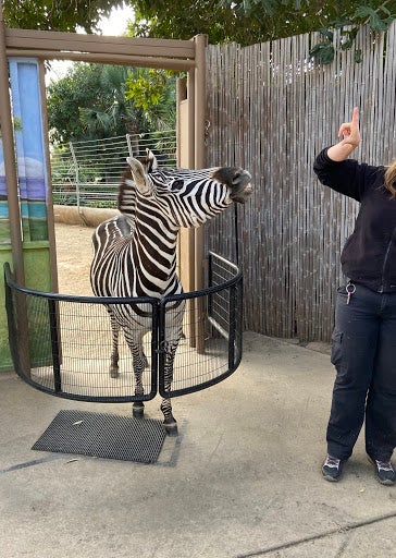 Going from a dance teacher to Lead Animal Trainer at the San Diego Zoo is a pretty big jump. Kelly Elkins has done performing arts her whole life, but she also knew she wanted to work with animals, so after 15 years of working at a dance studio she made a switch. During her time teaching she was also studying to be a veterinary technician but wasn't as interested in the medical aspect. It was when she applied and got accepted to Moorpark College’s Exotic Animal Training and Management Program, she dropped everything to study for two years. A month after graduating from the program, she got hired at the San Diego Zoo and after 20 years she hasn't regretted it at all. As a lead animal trainer she works training animals but also her fellow trainers, helping them improve their techniques. There is always something to work on as she constantly strives to build her relationship with these animals and also improve her technique so it's the most positive experience for the animal. There is a big element of choice in her work, where it is always the animals’ choice whether they want to participate in the training session, ensuring they always have a way to exit the situation if they choose. Another aspect of her job is outreach. Ms. Elkins always wanted a job working with animals but also to help conserve various species, and she found a way to help through outreach. By educating and connecting the public to different species, she strives to get people invested in their conservation and inspires them to help in any way they can.