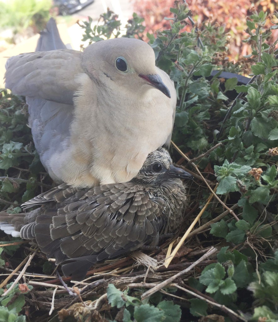 Among birds, both parents chime in with parental care in over 90 percent of avian species. Females often incubate the eggs, but her mate may bring her food while she is nesting and help feed the hungry chicks when they hatch. One common species you may encounter up close and personal is the ubiquitous mourning dove. These prolific birds inhabit much of North America and may have an astonishing six clutches per year. They are not afraid of people and may nest quite near high-traffic areas.