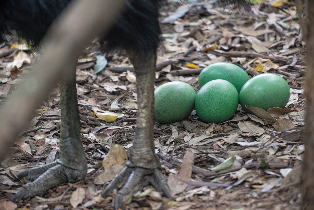 Another extreme example of paternal care is among the colorful, flightless cassowary of New Guinea, northern Australia, and surrounding islands.