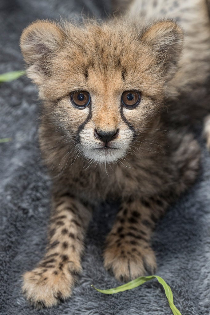 The female cub was born April 29 to first-time mother Mary Jane, at the Safari Park’s Cheetah Breeding Center. Cheetahs that give birth to only one cub, called a singleton, generally cannot produce enough milk to keep the cub alive and will often abandon the cub. To ensure survival of this cub, experts from the Association of Zoos and Aquariums (AZA) Species Survival Plan (SSP) made the recommendation for this cub to be hand raised.