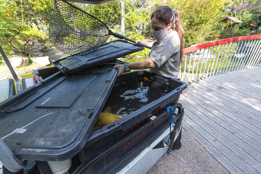 As a zoo vet, one of the things I really like about my job is that there’s always something new, and there’s always something to continue to learn about. This time, my patient was a fish— an approximately 35-year-old koi at the pond in the San Diego Zoo’s Terrace Garden. It wasn’t my first patient with fins. (Yes, fish get sick sometimes, too!) The veterinary school I attended, at the University of Florida, is one of the very few that includes the study of fish medicine (primarily aquaculture fish). Later, I got plenty of experience in caring for fish during my residency, at the Shedd Aquarium and Brookfield Zoo.