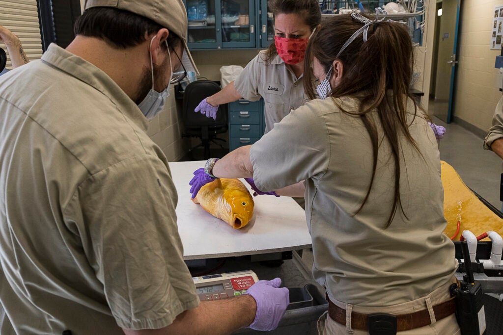 I was called in when wildlife care specialists noticed a skin mass on the fish. Our concern was that the mass could become ulcerated and affect deeper tissue, so they carefully transported the fish to the Zoo’s veterinary hospital, where it we have an exam table that’s just for fish, built by one of our registered veterinary technicians. On this table, we can constantly pump water over a fish’s gills—which is the only way it takes in oxygen—but the rest of the fish’s body is out of water, which allows us to use all of our typical tools for exams and surgery. An anesthetic powder is mixed into the water to immobilize and sedate the patient.
