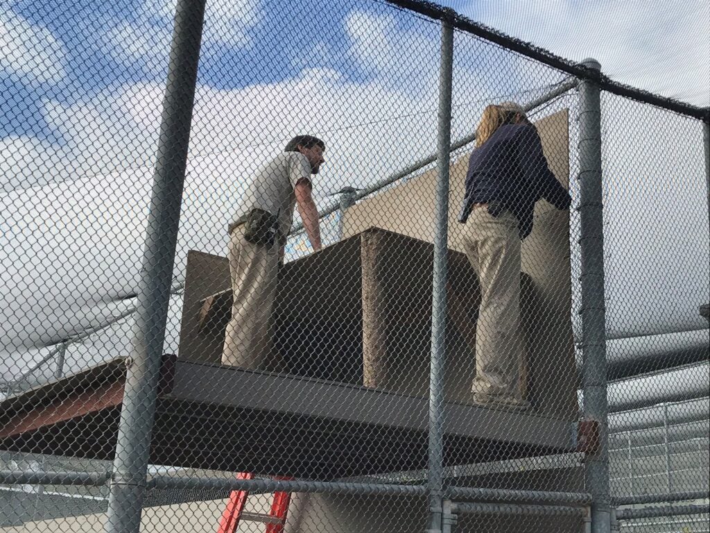 In the wild, Egyptian vultures nest in large trees, on the tops of buildings, or on cliff ledges, so we needed to provide our pair with the proper location and materials they would need to build their nest. We built a structure high off the ground for them to use—their own “cliff ledge” made of plywood.