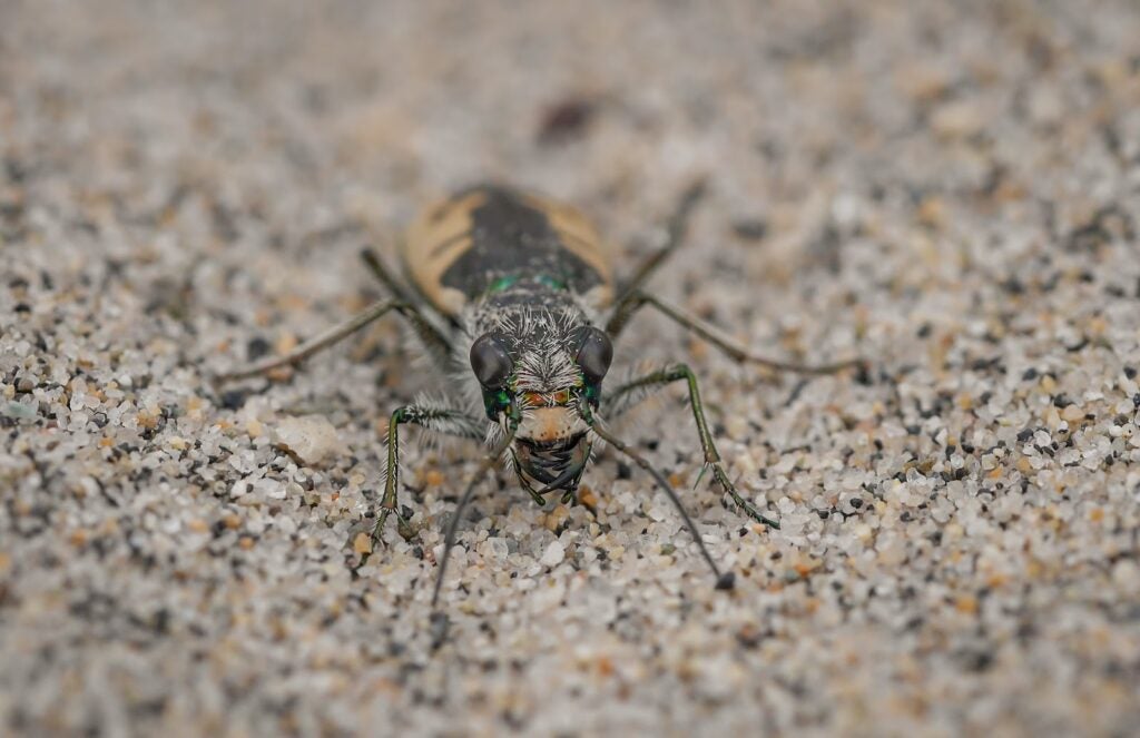 Tiger beetles (subfamily Cicindelinae) are easily overlooked due to their small size and flighty nature, but they are some of the most interesting beetles out there. Considered one of the fastest insects on Earth, they typically have enlarged eyes, long legs, and oversized mandibles. These critters are voracious predators, and their unique body structure aids in prey capture. For many Cicindelinae, their most notable feature is their bright coloration and complex patterns, complete with rainbow iridescence. While most are tropical, many can be found across North America in sand dune habitats and around bodies of water.