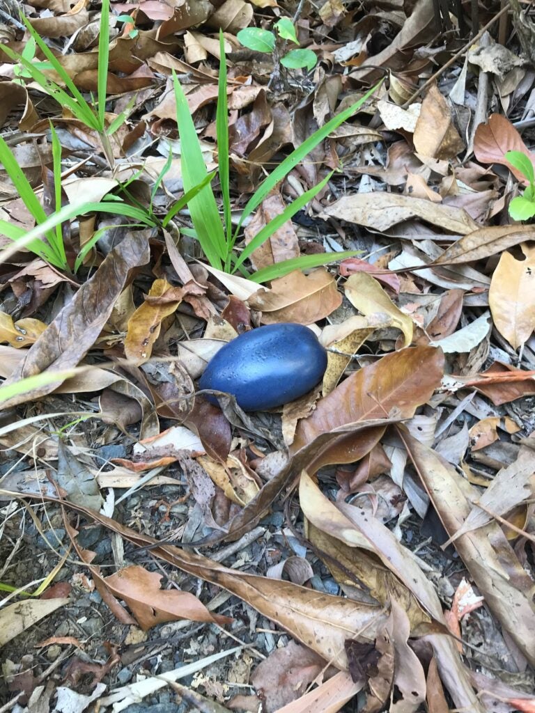 A fruit has two important parts—the flesh and the seed. The flesh is a tasty, easy to digest food that the plant offers the cassowary in exchange for dispersing the seed. The flesh is the reward the plant offers the cassowary in exchange for its gardening service. The cassowary swallows the fruit whole, digests the flesh, and deposits the seed in a nice pile of fertilizer somewhere else. Only large animals, a cassowary can swallow massive fruits like the cassowary plum.