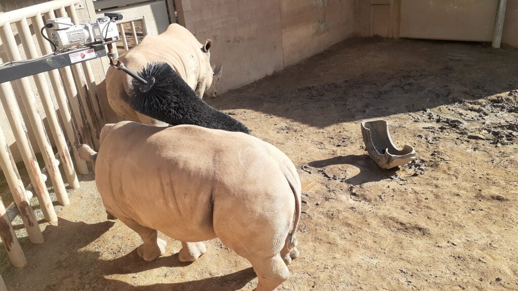 Mr. Popichak’s job as a Wildlife Care Specialist is to work together with his colleagues and the rhinos in their care to carry out tasks vital to the program’s main goal. This goal is to help bring back the northern white rhino from the brink of extinction, as well as repopulate the southern white rhino. One way this is done is by working to educate the public on the effects and dangers of poaching, as well as alternative methods to traditional cultural medicines that use things such as rhino horn as an ingredient. Another way Mr. Popichak and his team work to help rhinos is by training the southern white rhinos at the RRC to participate in their own health care, which allows the Care Specialists to humanely perform procedures such as blood draws, ultrasounds, and regular exams and checkups. Each member of Mr. Popichak’s team works as a primary trainer with a few rhinos (primary trainers teach new behaviors) and as secondary trainers with the others (secondary trainers work to make sure already learned behaviors aren’t forgotten). They use a variety of ways to help the rhinos learn, such as operant conditioning and positive reinforcement. They also use specific tools to help communicate while training, such as whistles and clickers. Teaching the rhinos to associate a procedure with treats or other rewards helps the southern white rhinos to be as healthy and happy as possible, and be valuable contributors to help their own subspecies grow as well as their northern counterparts.