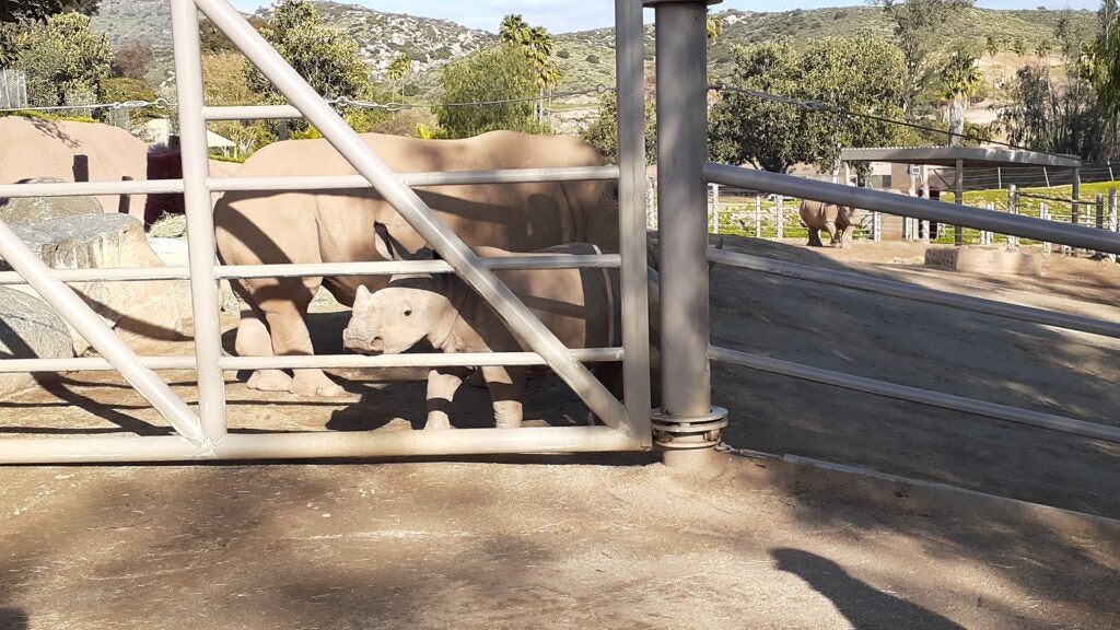 As a Senior Wildlife Care Specialist at the RRC, Mr. Popichak’s job never ceases to surprise him– even after 12 years! Having worked with every rhino at the center, one of Mr. Popichak’s favorite experience has been working with Wallis, a southern white rhino who came to the Safari Park in November of 2015. When she first arrived, caretakers noticed discharge coming out of a small hole near her heart. Over the next six months, she went through two separate surgeries in an attempt to clean out and heal the wound, but the pin-sized hole would still not fully close. It wasn’t until training Wallis to stand still for an X-ray, done by a machine the San Diego Fire Rescue Bomb Squad lent them, that her caretakers were sure the reason for the hole was a bullet. Wallis was most likely shot by a poacher back when she was living in the wilds of South Africa. Luckily, over the course of her treatment, the bullet fragment naturally surfaced like a splinter, and the attending veterinarian was able to pull it out with pliers. Without the immense amount of trust Mr. Popichak had built up working with Wallis, treating her would have been more challenging. Comparing his relationship with animals to a bank account, each interaction being a deposit of trust, it was a lot to ask of Wallis to undergo multiple surgeries so soon after her arrival. Wallis continues to thrive at the RRC with Mr. Popichak, who works as her primary trainer.