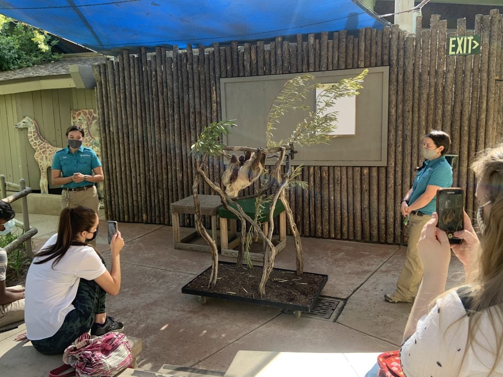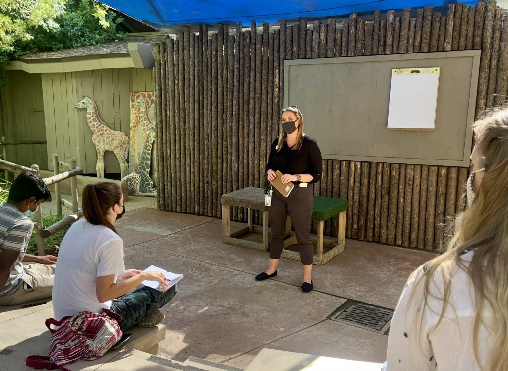 Although Ms. Radosevich doesn’t work with her favorite animal (the moose), she enjoys many aspects of her job. Ms. Radosevich’s favorite is surprisingly not the animals, but the people she meets and works with. She loves teaching, learning, and meeting new wildlife care specialists and guests. Throughout her time at the Safari Park, she has found that working with teams that are open-minded and willing to try new things can be the most rewarding. Her favorite moments are when certain teams implement practices or activities to encourage the wildlife to participate in new and stimulating experiences. She loves that her job connects her with other departments and co-workers such as veterinarians and wildlife care specialists. At the same time, a challenging part of her job is working alone and the large amount of independence that comes with her responsibilities. The interns also met Xela, a Wildlife Care Specialist, who shared some insight on her favorite parts of her job like working with different wildlife species. She loves how unique they are, the special care it takes to maintain their health, and how their presence gives a long-deserved spotlight to their populations. Ms. Radosevich works with teams like Xela’s to help ensure the wildlife at the Safari Park thrive.