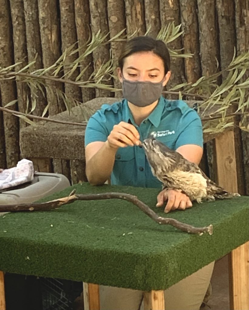 Ms. Radosevich also works with wildlife that may require even more specialized welfare plans, such as Kermit the tawny frogmouth. Often confused for being an owl, the tawny frogmouth is a relative of the nightjar and a bird native to Australia. They inhabit forests, scrubland, eucalyptus and acacia woodlands, and suburban parks. One of their most distinctive features is their frog-like mouth designed for capturing insects and small animals. Considered to be among Australia’s most effective pest-control birds, the color of their plumage resembles tree bark. In addition to being beneficial for hunting, when a tawny frogmouth senses danger, it expands its neck, closes its eyes, and freezes to appear as if it is just a broken branch in a process called stumping. Kermit in particular only has one wing, so he cannot move around as easily as other frogmouths in their natural habitat. With his welfare in mind, Kermit’s habitat has been modified to be more accessible to a bird that cannot fly. His habitat is designed to be accessible by jumping with low sitting perches and smaller gaps in between branches. Due to his unique circumstances, Kermit was chosen to represent his species as a wildlife ambassador at the San Diego Zoo Safari Park.