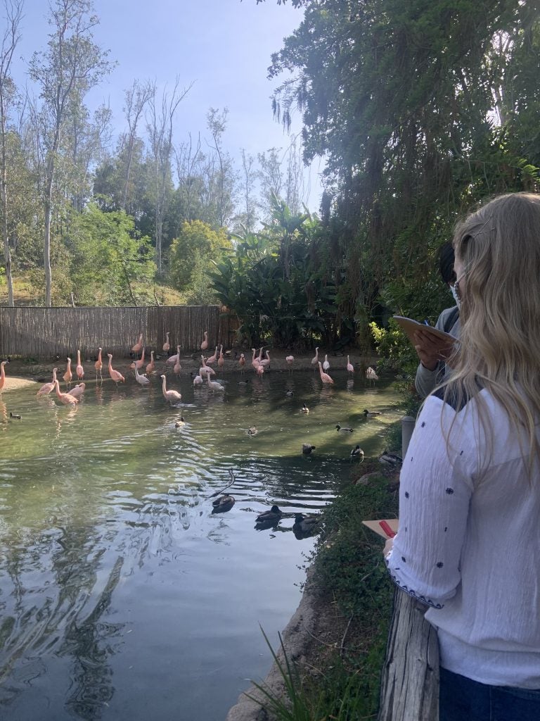 Consider an animal’s environment. A great portion of an animal’s welfare relies on the environment they live in simply due to how they have evolved to fit their natural habitats. For example, Ms. Radosevich had the pleasure and privilege of working with the wildlife specialists caring for Everest, the albino wallaby, who requires a very specialized environment to achieve a high measure of animal welfare. Due to his albinism, Radosevich and the wildlife specialists at the Safari Park have to take precautionary measures to keep him out of the sun due to his heightened sensitivity to ultraviolet rays. When necessary, they often monitor the wildlife for ten minutes, two to three times a week to properly assess the wildlife’s needs. In these ten minutes, Ms. Radosevich watches for behaviors which directly respond to an external stimulus, or cause. Then, she acts accordingly, collaborating with her colleagues to modify the wildlife’s environment to support their welfare. For example, let’s take a look at the flamingos. In order to fully thrive, their native habitat must be considered: shallow waters for wading, algae to satisfy their senses, fellow flamingos for companionship, the list goes on. Without these factors that Radosevich and her team have carefully integrated into their habitat, the flamingos’ welfare would not be as high as they currently are at the Safari Park. Ms. Radosevich strives to continue developing a relationship between the animals she works with and their respective environments as she finds more and more ways to keep their welfare to the highest degree possible.