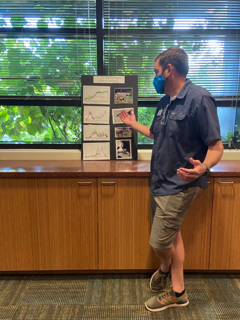 The passion Dr. Tubbs and Mrs. Felton have nurtured throughout their careers is unparalleled. Dr. Tubbs credits his inspiration for getting involved with wildlife conservation to his first day of general biology at the University of Florida. He graduated high school wanting to be a veterinarian but his freshman year professor told great stories about his time doing hands-on research with alligators in the Florida swamps and marshes. Dr. Tubbs then realized that research was something he was interested in pursuing. After expressing this, his professor gave him the opportunity to join him on his research trips, which he of course jumped at. The same professor helped expose him to the world of conservation, leading him to a major in zoology and a PhD related to fish reproduction from the University of Texas. When it came down to starting his career, Dr. Tubbs had one requirement: a job he loved doing, which included research and paid travel. In 2007, he found a position which offered both at the San Diego Zoo Wildlife Alliance (SDZWA). True to his second wish, he was given the chance to travel to South Africa to do more hands-on research with rhinos in 2018. Mrs. Felton has a very different story. She currently holds the position of Lab Manager of the endocrine lab for the Reproductive Sciences group. She said that growing up she had always loved visiting her local zoo. Mrs. Felton started her academic career at Missouri State University, studying animal science. After her studies, she found work and internship opportunities at the Dickerson Park Zoo in Springfield, Missouri. She also spent time with the Reproduction Sciences group at the Beckman Center as a part of the Summer Student Fellowship program. She returned to Missouri to finish up her goal of getting her masters degree and found work as a veterinarian technician. When a permanent position opened with the Reproductive Sciences group she returned and officially started in 2011.