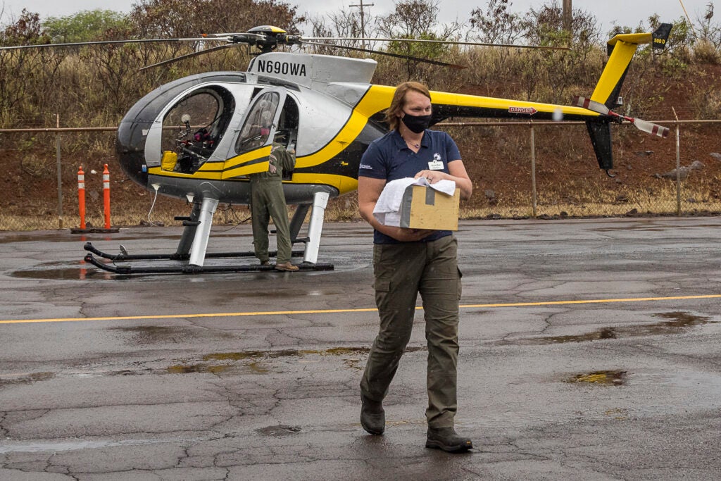 On Dec. 5, a helicopter was dispatched from Maui to Kaua‘i to pick up the bird. After a two-hour flight, it arrived at the Kahului Airport around 1:30 p.m. On the landing pad, SDZWA veterinarian Dr. Deena Brenner peered into the bird’s transport box to give it a quick check, and quietly exclaimed that it appeared to be healthy and well.