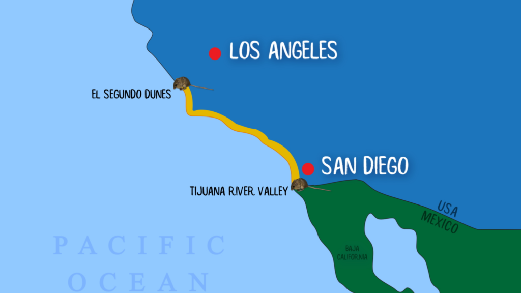 Pacific pocket mice are endemic to Southern California, meaning they are found nowhere else on Earth. Historically, they inhabited coastal areas from Los Angeles to the Tijuana River Valley. Due to a dramatic population decline, today they are mostly missing from their coastal habitats. There are only three small populations of Pacific pocket mice remaining, two in protected areas on Marine Corps Base Camp Pendleton in Oceanside, and one on Dana Point Headlands, in Dana Point—where Pat’s family lineage has been traced.