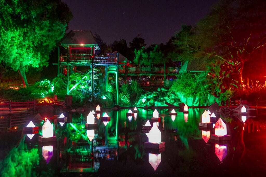Nairobi Village is brimming with holiday cheer, beginning with the Safari Park’s own Safari Parker, who will share his “Twas the Night Before Wild Holidays” with guests in the Village Playground. In the mood for a festive sing-along? Our Holiday Troubadour and his acoustic guitar, also at the Playground, will add to the holiday feel. At Flightline Plaza, our violin duo—the Turtle Doves—will wrap seasonal music up with a “bow.” Keep your eyes open—and looking up—around Flightline Plaza and beyond, as the mesmerizing Firefly Stilt Walkers move about, casting their magical glow. The Enchanted Lagoon lives up to its name nightly, as Mombasa Lagoon comes to life with sparkling, flickering, floating holiday lights, adding seasonal ambience to the beauty of the lighted waterfall.