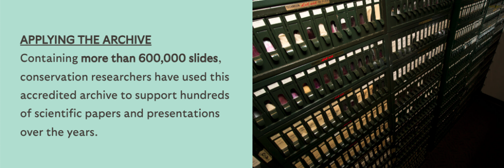 The samples banked in the Pathology Archive are acquired post-mortem. These samples provide an important window into the health of wildlife populations. The collection’s tissues, pathogens, slides, and photos are a resource to inform care and conservation decisions. Though no animal lives forever, samples taken post-mortem can extend the scientific afterlife of animals for decades or even hundreds of years, throughout which they may continue to contribute to the global scientific community’s understanding of wildlife health.