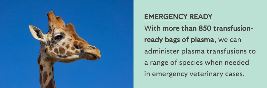 The samples in our Clinical Repository can be analyzed for the presence of elements such as viruses, antibodies, hormones, or minerals; understanding the samples’ composition is critical in making decisions about wildlife health, management, and care. Our plasma collection ensures that we can administer plasma transfusions to a range of species when needed in emergency veterinary cases. Studying samples in this subcollection also allows scientists to develop novel diagnostic tools and protocols, benefitting wildlife around the world.