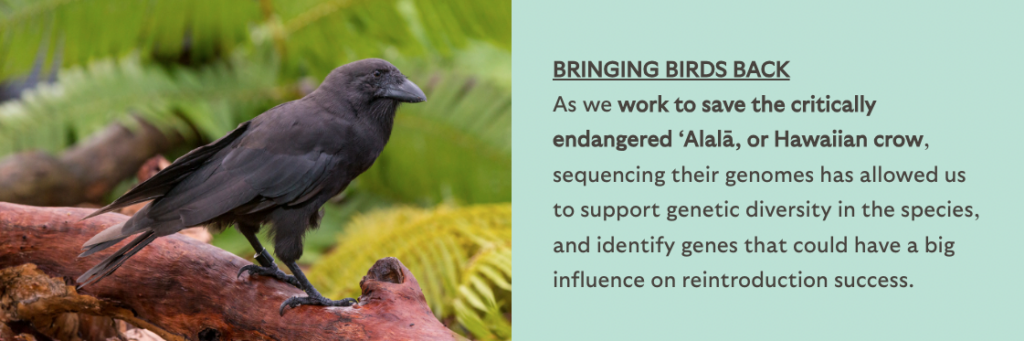 Our banked DNA (extracted from banked cells, blood, and tissues) can be used to sequence and analyze wildlife genomes, which clarifies individual and species-level genetic makeup. This information is crucial in illuminating wildlife physiology, behavior, and evolution. We use genetic tools to monitor and manage species in their native habitats and under human care, as well as to study genetic bases of diseases and the evolutionary potential of species to survive and adapt in our rapidly changing world.