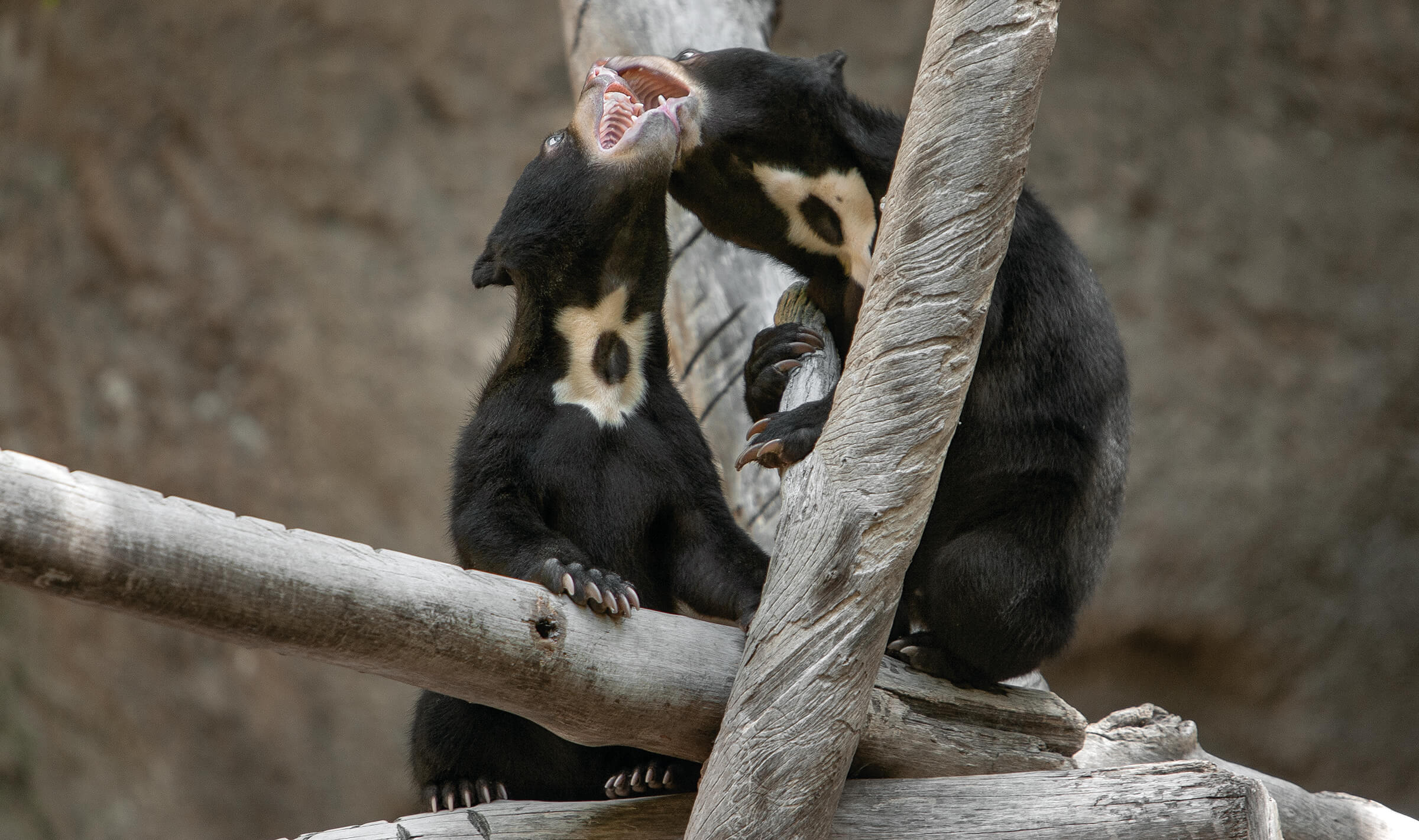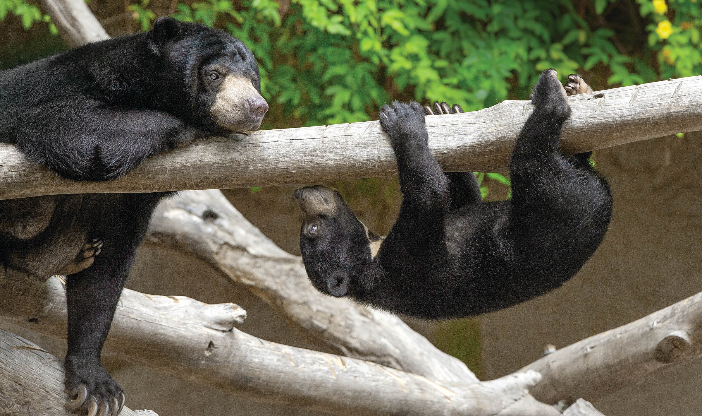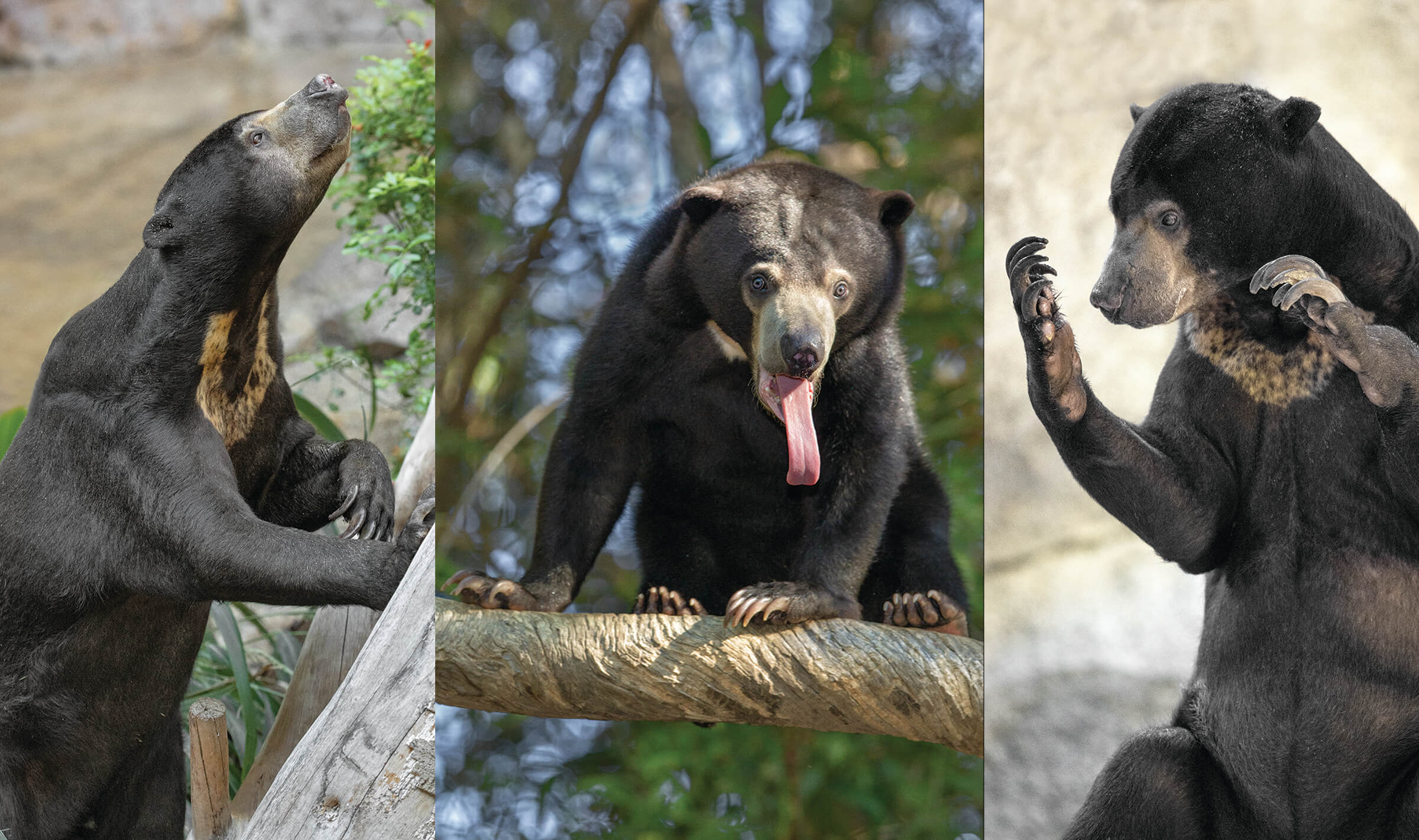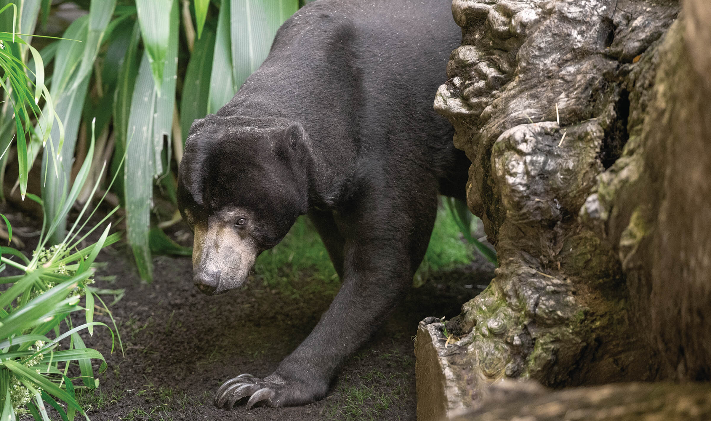 The San Diego Zoo first introduced members and guests to this species in 1928, and sun bears, both Malayan and Bornean, have been leaving their mark on Zoo history ever since. That first bear quickly crumbled and bent a climbing tree made of concrete with internal metal reinforcement—starting the Zoo on what was to be a long learning curve on the destructive capacity and strength of sun bears! The Zoo’s Sun Bear Forest Habitat opened in 1989 and was initially home to five young sun bears that kept themselves busy by rolling sod into the pool, taking down trees, and finding footholds in the perimeter walls of the habitat. An innovative feature of the habitat was an artificial tree with a remotely operated, built-in honey dispenser. The bears responded to the dispenser’s “off time” with an inquisitive and intelligent decision to find the source of the honey. Their strength overpowered the artificial tree, and they destroyed it, along with the honey dispenser. Sun bears are literally built for this type of task. A sun bear’s inward-directed paws, bowed limbs, and strong muscles support arboreal activities with ease. With their strong jaws and claws, they rip and shred trees to expose food items such as termites and stingless bees.