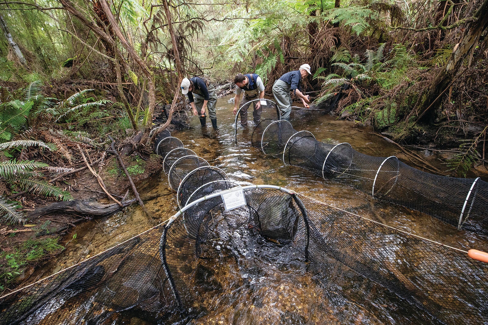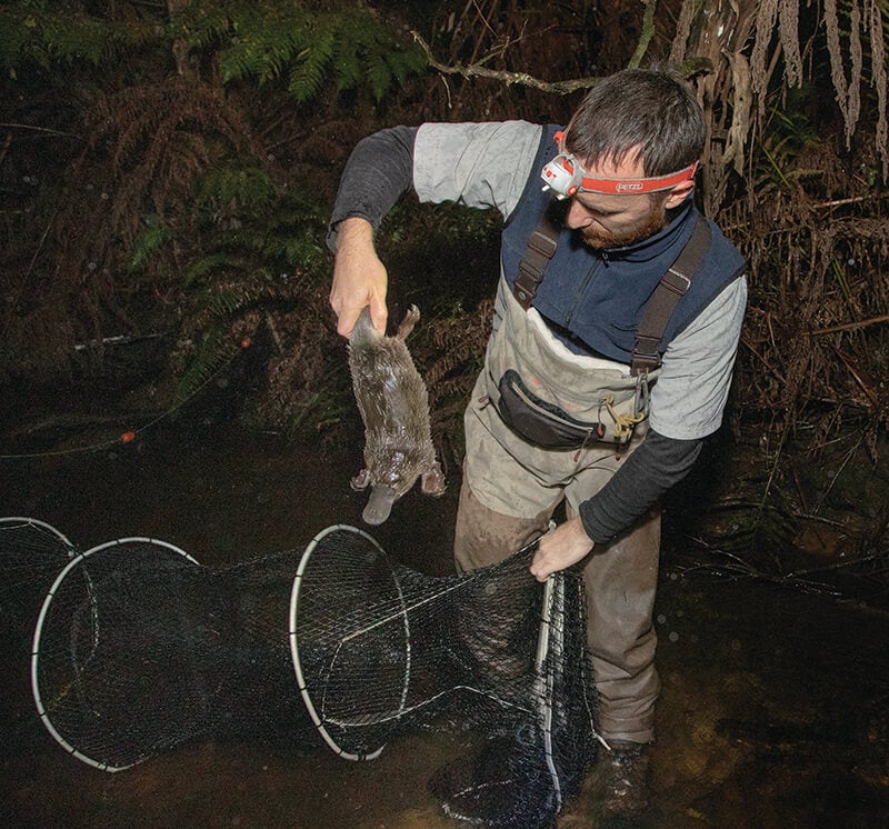 PLATYPUS RESEARCHIn a related project, researchers set up specialized nets that will temporarily trap platypuses.[/caption] “We are two years into a three-year project,” explains Bob. “Researchers are comprehensively mapping the current distribution of platypuses.” They are doing so in an innovative way, analyzing water samples from hundreds of waterways in southeastern Australia to identify traces of DNA. While it may be hard to see a platypus, all animals leave traces of their DNA behind—in skin cells, hair, feces, or mucus, for example. Water samples contain traces of this “environmental DNA” (eDNA), and with this noninvasive method, researchers can create a spatial map of the species that are found at the sampled sites. [caption id="attachment_133572" align="aligncenter" width="800"]