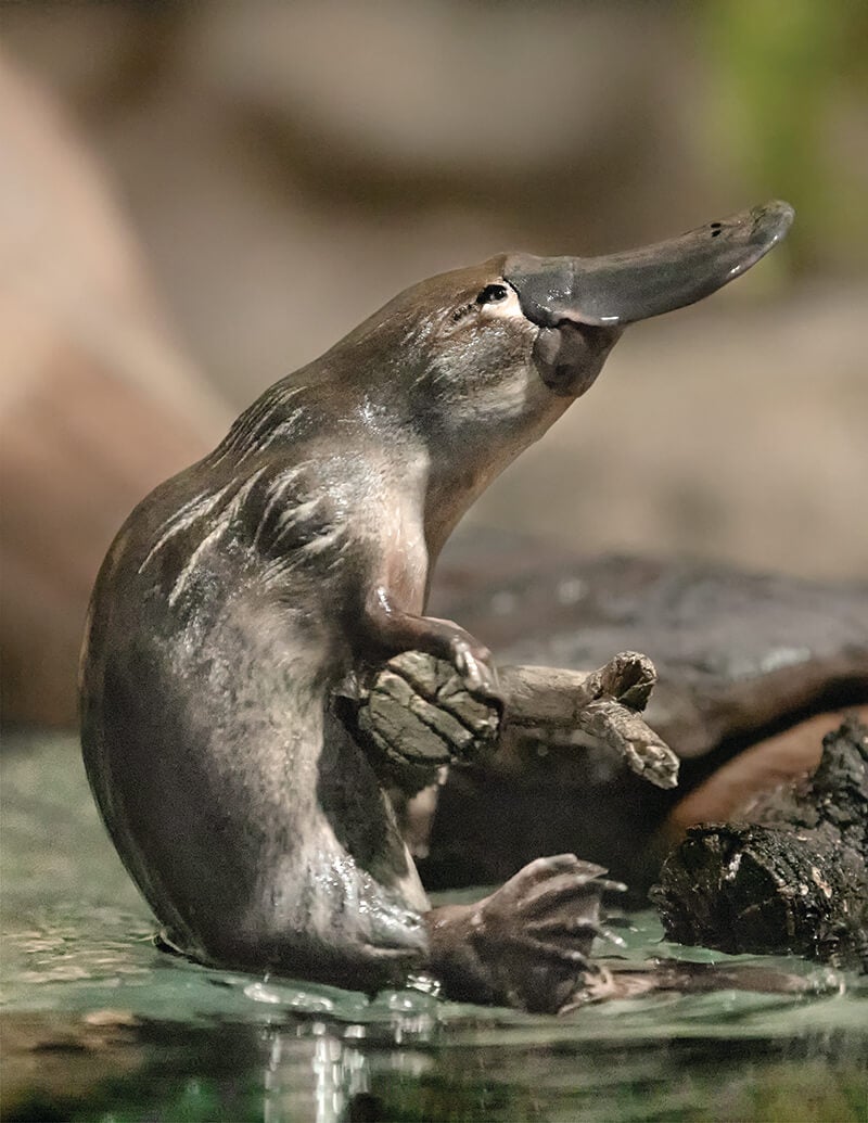 "one important thing I learned was how to safely handle male platypuses without getting envenomated,” says Luis. Platypuses—males, anyway—are venomous. On each of its hind ankles, an adult male has a tiny spur that’s connected to a venom gland. Venomous spurs are an adaptation for male combat during the intense competition for females during the breeding season. To envenomate, a platypus wraps its hind legs around its rival and drives in its sharp spurs. In a human, injury causes swelling, fever, and nausea—and reportedly it hurts like the dickens. There’s no antivenom—the only treatment is for pain relief. (There’s never been a fatality, though.) So, picking up and handling a male platypus takes know-how. Males and females look very much alike, so the key to staying safe, says Luis, “is to treat each individual like it’s a male. If someone gets envenomated, it’s usually because they assumed the platypus was a female when it wasn’t.”